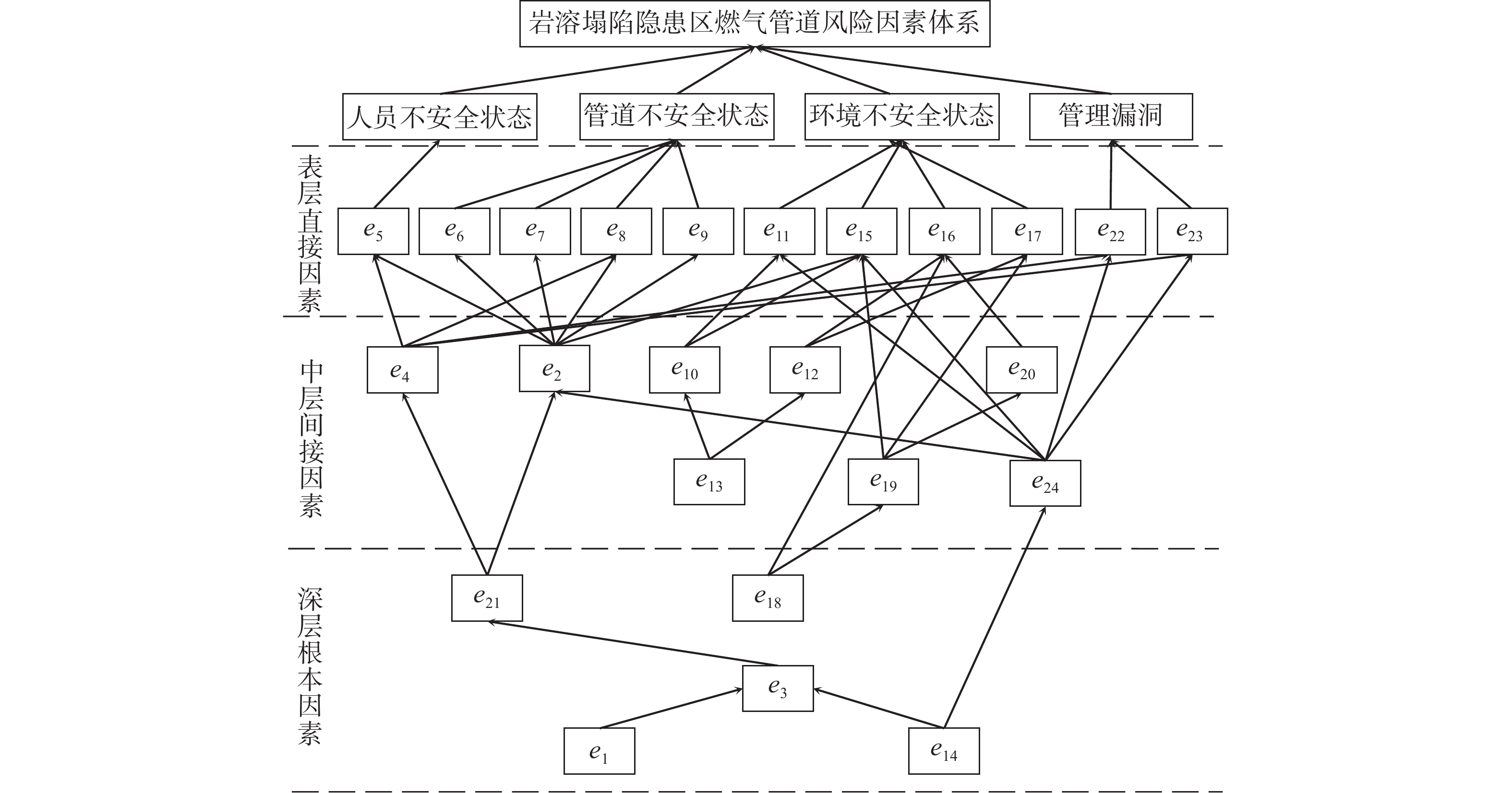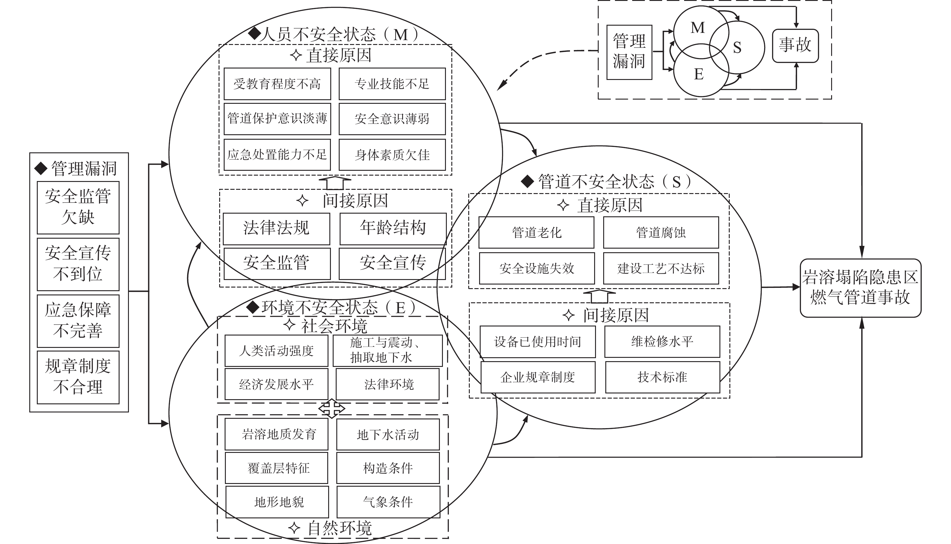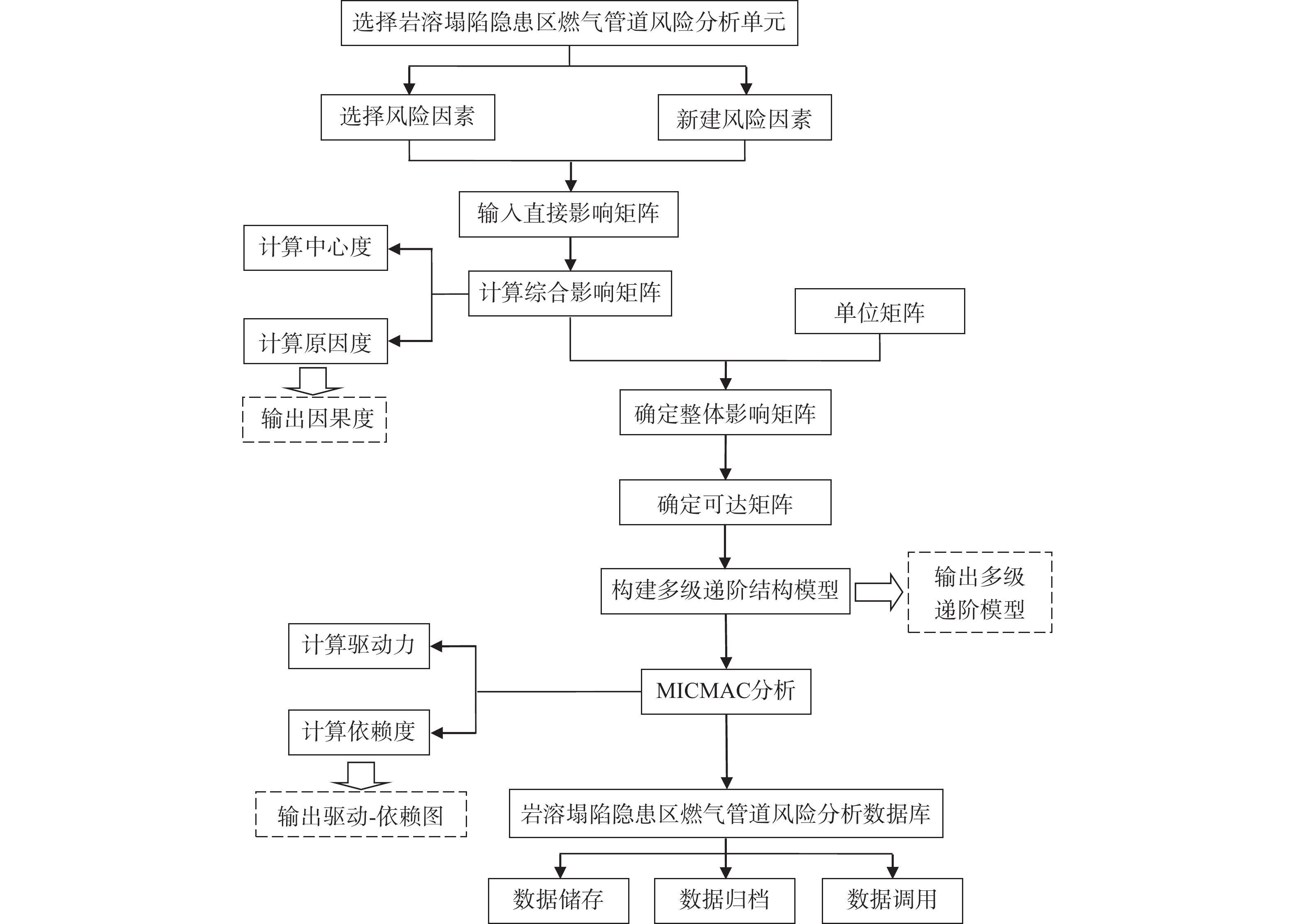 To mitigate the risk of gas pipelines in karst sinkhole-prone areas, this study employs the DEMATEL/ISM method to elucidate the hierarchical structure and causal relationships among various factors in the system, considering four categories of accident causes: human, material, environment and management. Additionally, the MICMAC method is utilized to analyze the dependence and driving force of risk factors. Utilizing the Visual Studio platform, the software for risk analysis of gas pipelines in karst sinkhole-prone areas is developed. This research introduces the D/I-MICMAC-VS integrated risk analysis method and provides an example analysis. The results demonstrate that: (1) The risk factors for gas pipelines in karst sinkhole-prone areas are distributed across six levels. The possibility of risk accidents can be reduced in the short term by rigorously managing surface-level direct factors, while middle-level indirect factors play an intermediary role in the system. Effective control of gas pipeline accidents can only be achieved by addressing deep-rooted factors fundamentally. (2) The spontaneous cluster serves as a key element for risk management and control of gas pipeline accidents, and prioritized intervention significantly aids in accident prevention. The independent cluster directly influences the system’s risk level through its own changes and development. The linkage cluster plays a pivotal role in transmitting and promoting the evolution and development of accidents. Effective risk management and control can be achieved by discerning the deep root factors that inducing changes in the dependency cluster.