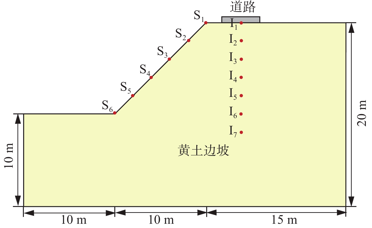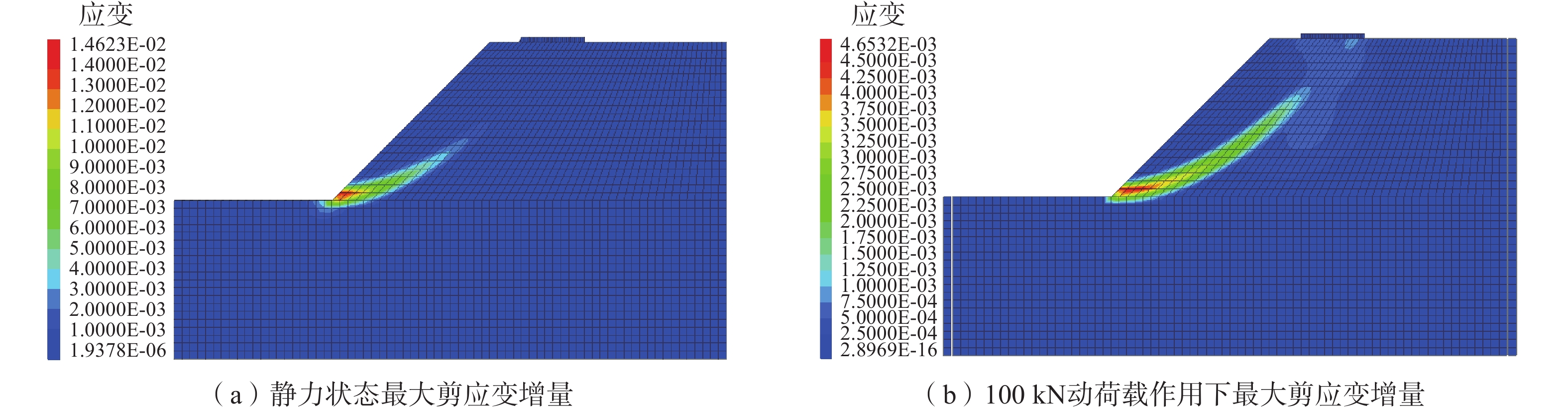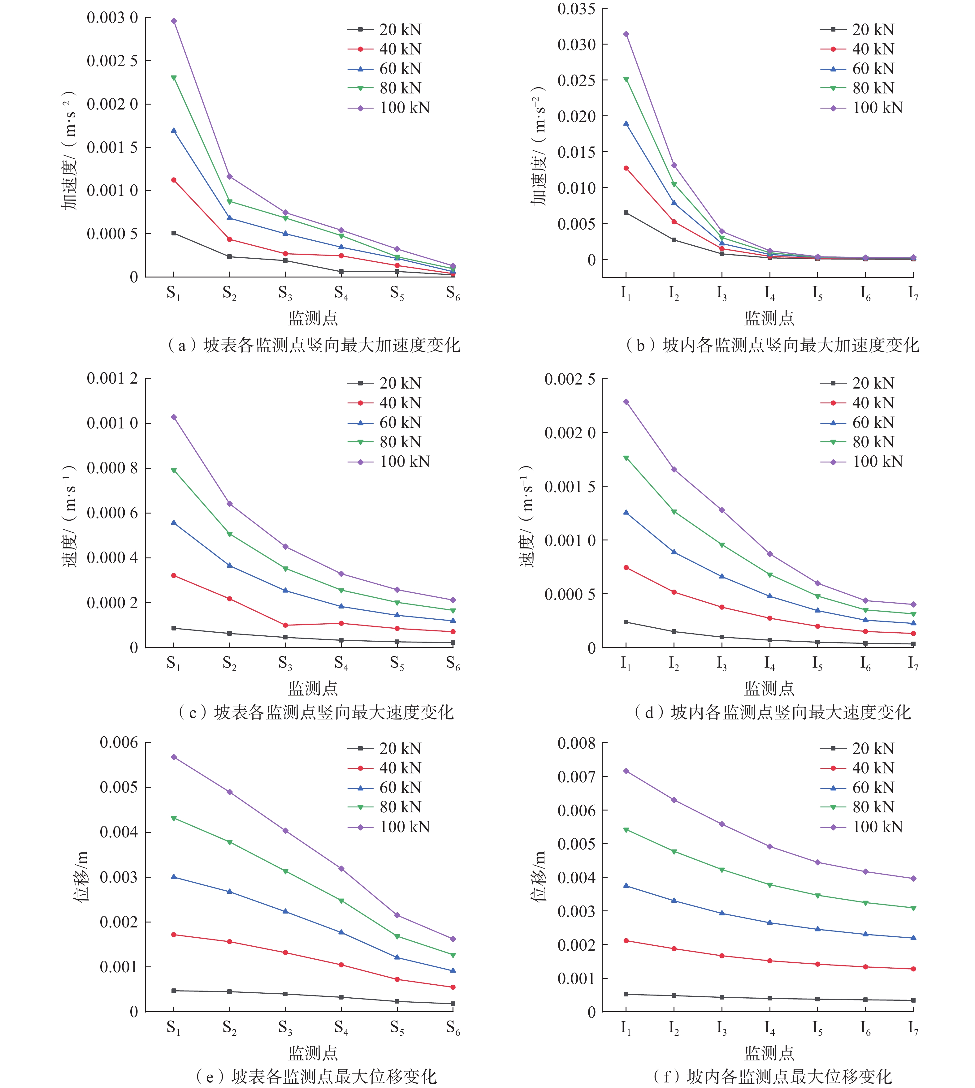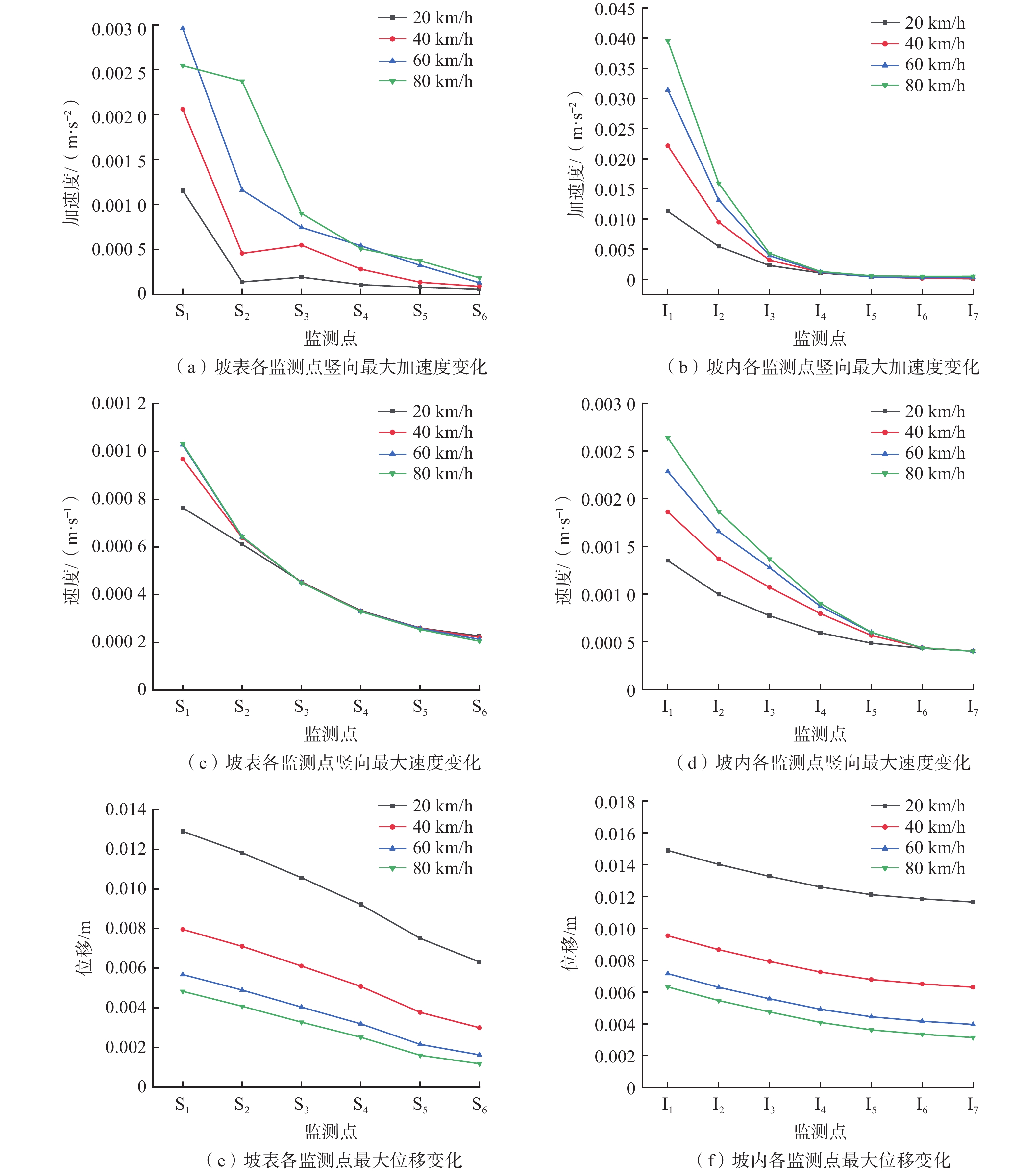 This study aims to explore the dynamic response of loess slopes under traffic loads. By using finite difference software, a comprehensive numerical model of a typical loess slope was established. The analysis focused on understanding variations in slope deformation, vertical maximum acceleration, velocity, and displacement on the surface and inside of the slope under different axle loads and vehicle speeds. The results show that after applying traffic load, the shear strain increment zone of the slope extends from the toe to the crest. This extension indicates a potential development of the slip surface, and the instability of the slope begins with shear failure at the toe. As the distance from the load source increases, the vertical maximum acceleration, velocity, and displacement at each monitoring point on the surface and inside of the slope gradually decrease. Under the same speed and different axle load conditions, as the axle load increases, the vertical maximum velocity, acceleration, and displacement at each monitoring point on the surface and inside of the slope all show an increasing trend. Under fixed axle load and different speed conditions, the vertical maximum acceleration and velocity at each monitoring point inside and on the surface of the slope generally increase with the increase of vehicle speed, while the displacement gradually decreases with the increase of driving speed. The research findings have important theoretical significance and practical engineering application value for understanding the dynamic response of loess slopes to traffic load and road construction within loess regions.